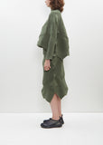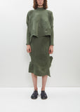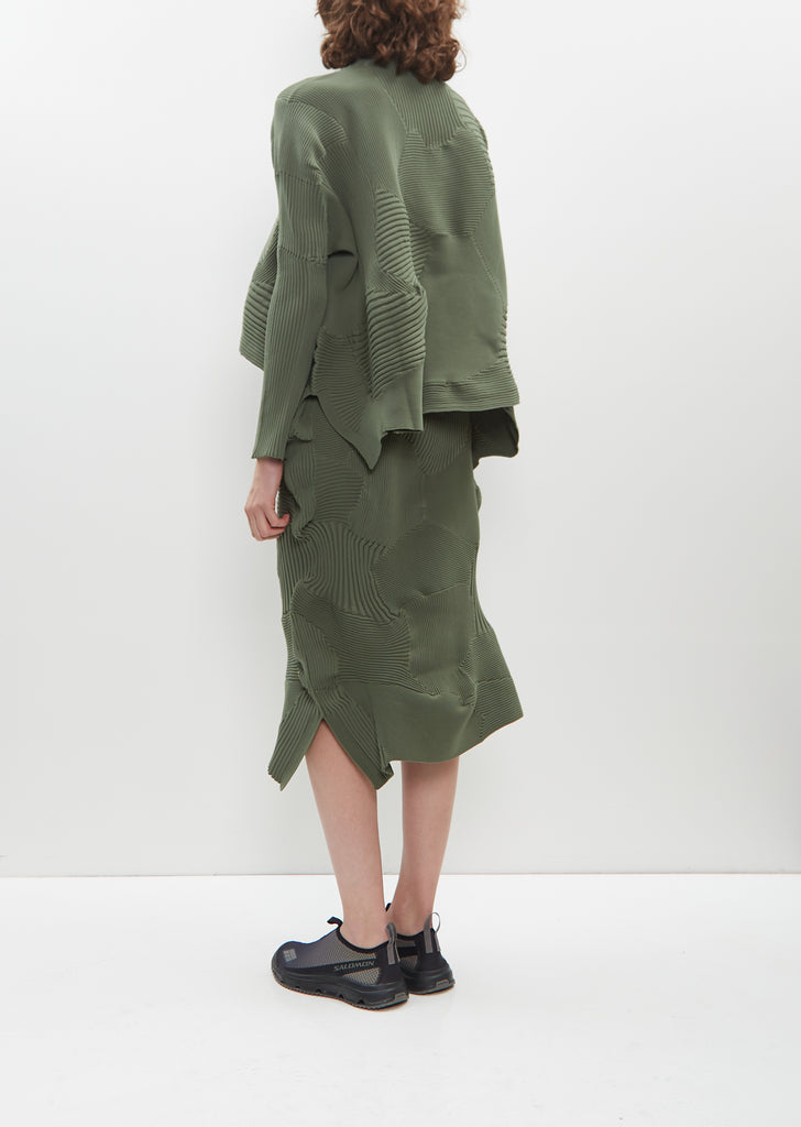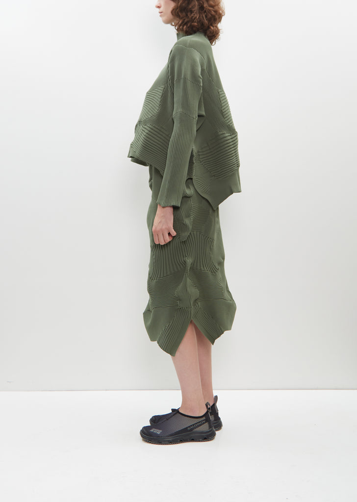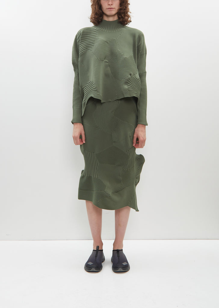 Issey Miyake green sweater with a high neck in patchwork ribbed knit. This knitting technique is created by combining multiple knitting patterns and is finished with a curved, asymmetrical hemline. Relaxed fit.