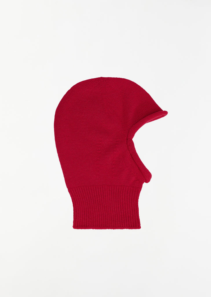 Issey Miyake nadeshiko red balaclava with rolled finish at face opening and ribbed trim at neck in merino wool.