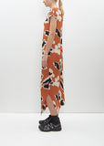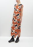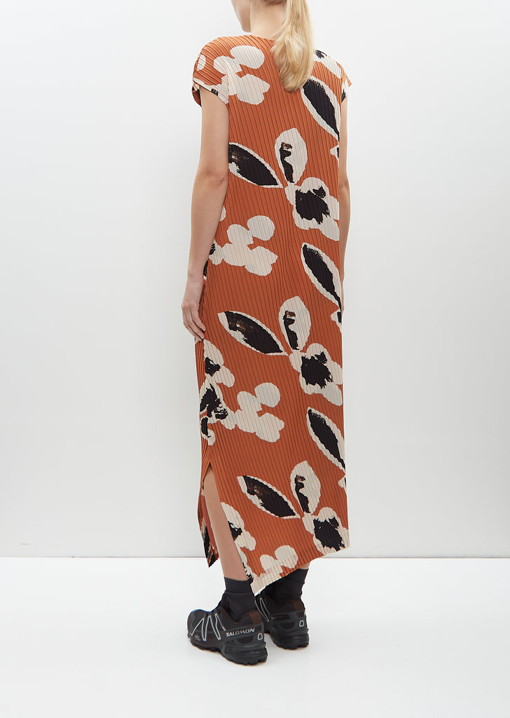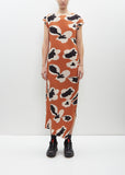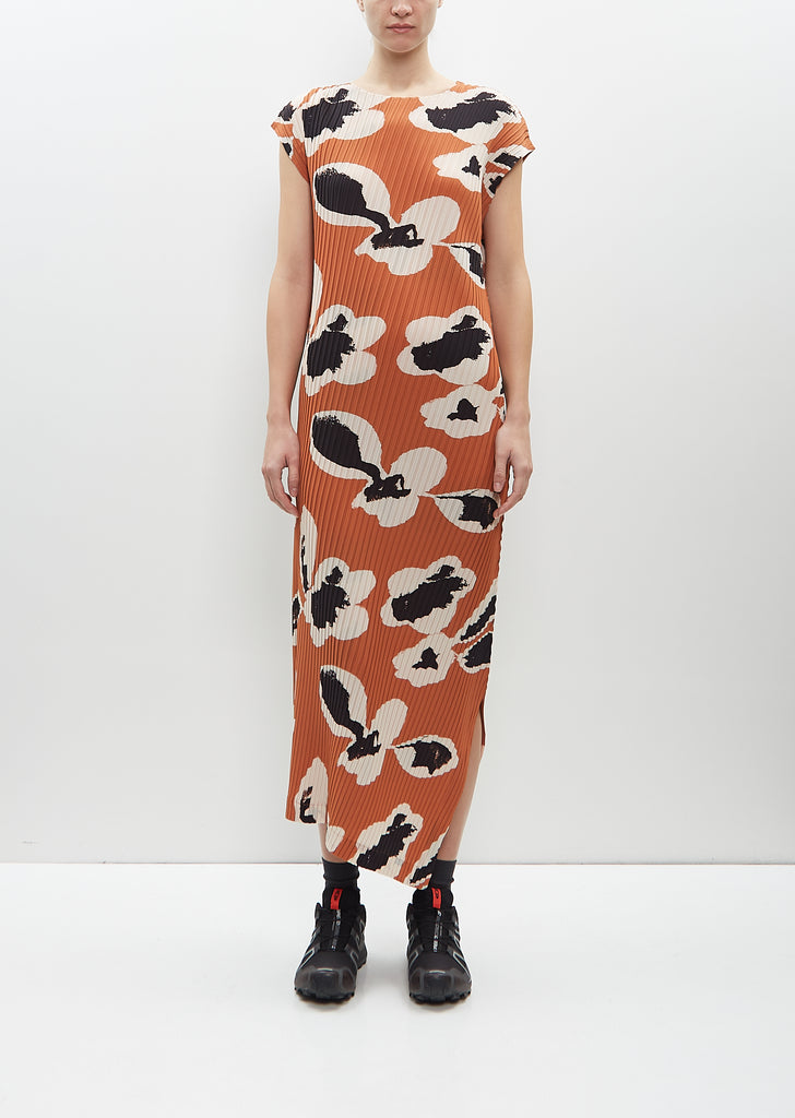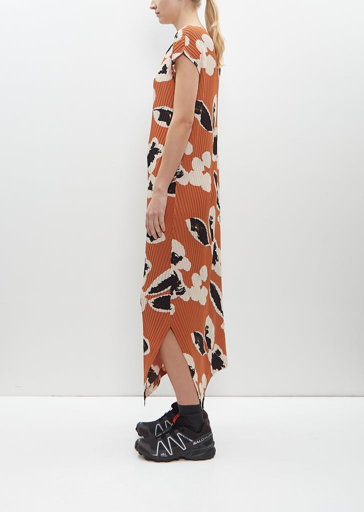 Issey Miyake brown-hued dress with abstract floral pattern in pleated mid-weight crepe. Features round neck and asymmetric hem with side slit.