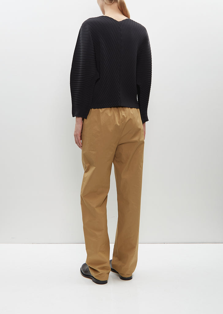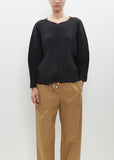 Issey Miyake black blouse with subtle V-neckline and dolman sleeves in pleated mid-weight crepe.