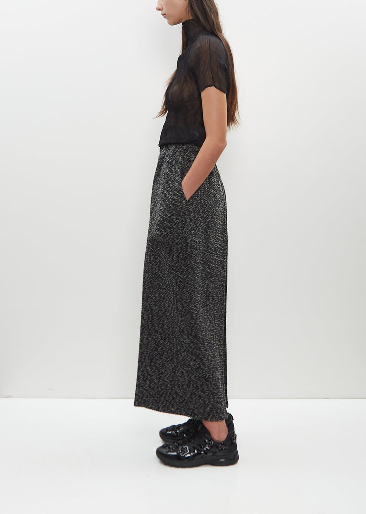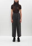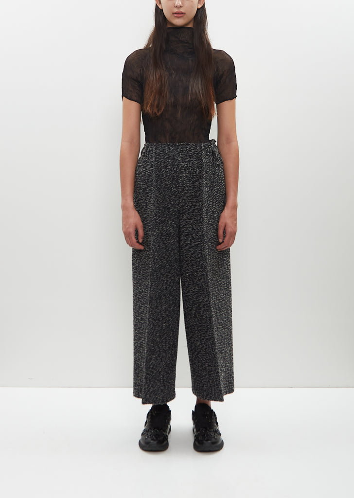 Issey Miyake black and white pull-on pants with slightly tapered cropped legs in lightweight wool blend knit. Features an elasticated waistband, angled pockets and a center seam at front and back legs.