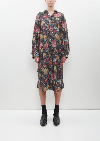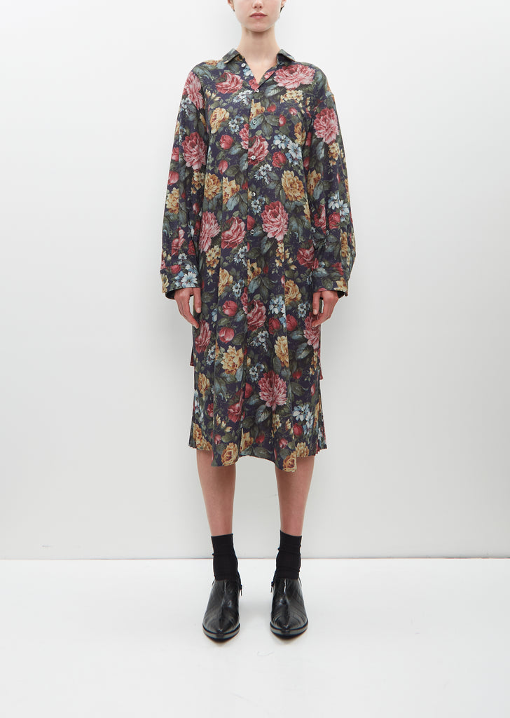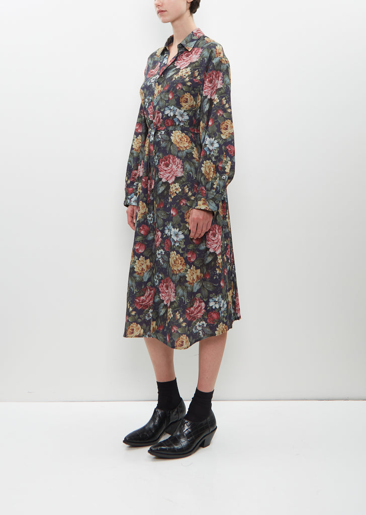 Junya Watanabe shirt dress with pleated back in navy and red floral printed polyester and wool blend, with a soft hand and fluid drape. Features a shirt collar, cuffed sleeves, and comes with a thin self belt to tie at waist or wear loose. Single chest pocket. Regular fit.