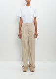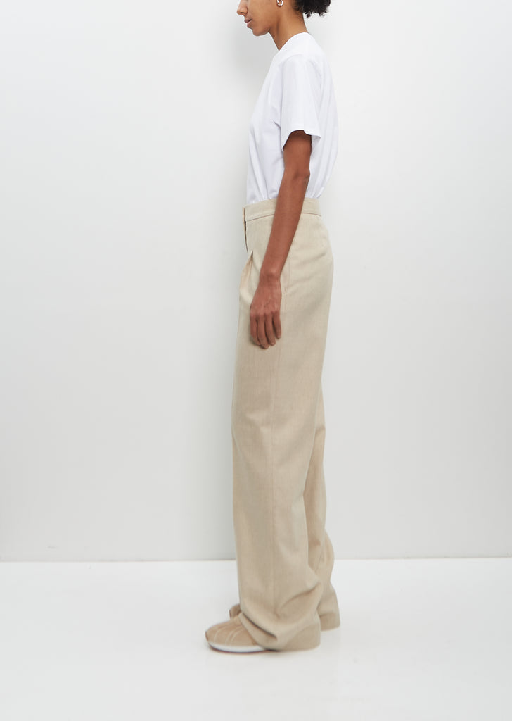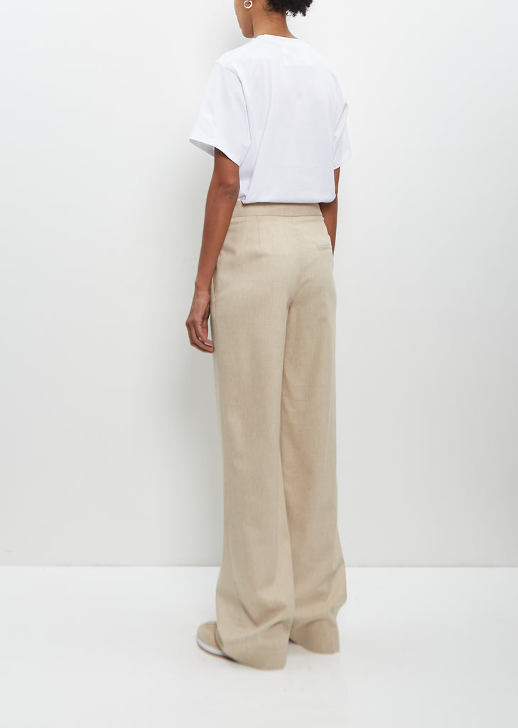Loulou de Saison beige straight pants with wide legs and front pleats in virgin wool and cashmere blend. Features angled front pockets, a single welt pocket at back and button, hook and eye zip-fly fastening at front.