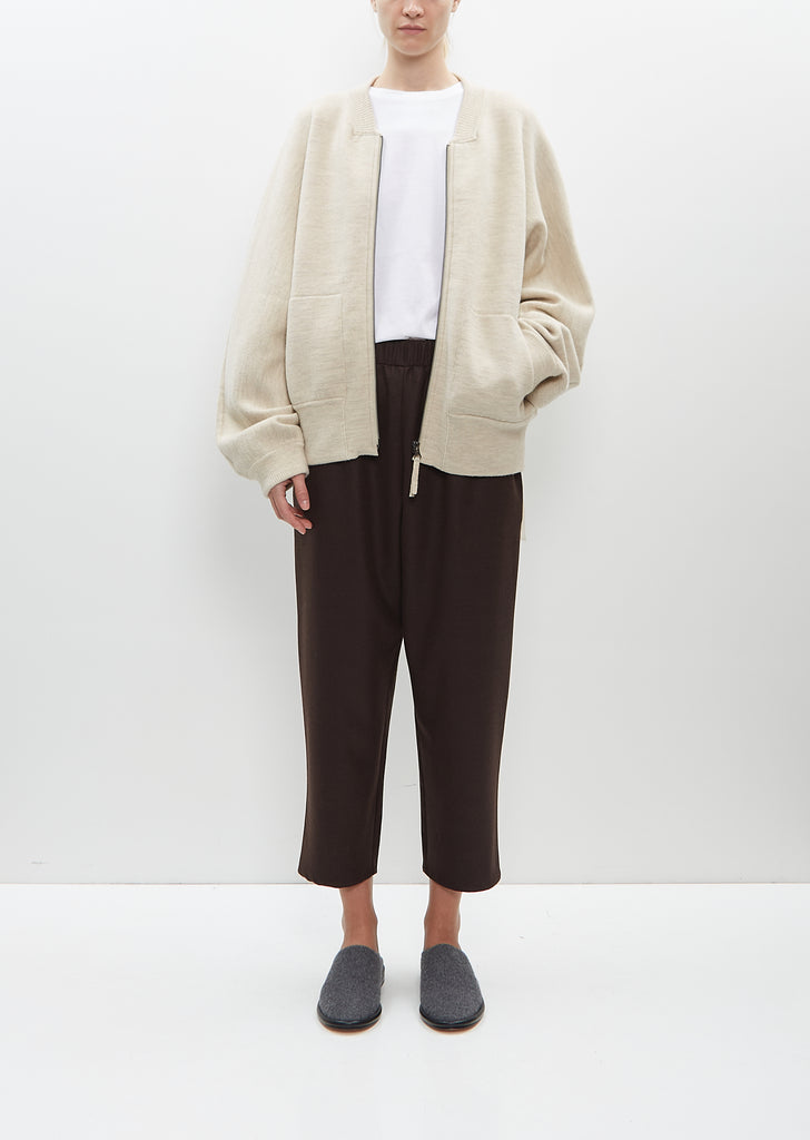Lauren Manoogian ecru bomber in merino wool and alpaca blend double knit. Features a soft V-neck, two front patch pockets and zipper closure at front. Finished with a ribbed trim along neckline, cuffs, and hem.