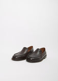 Marsèll dark brown loafer with thin piping detailing handcrafted in soft polished leather. Features a hand-colored natural leather sole with a stacked rubber heel.