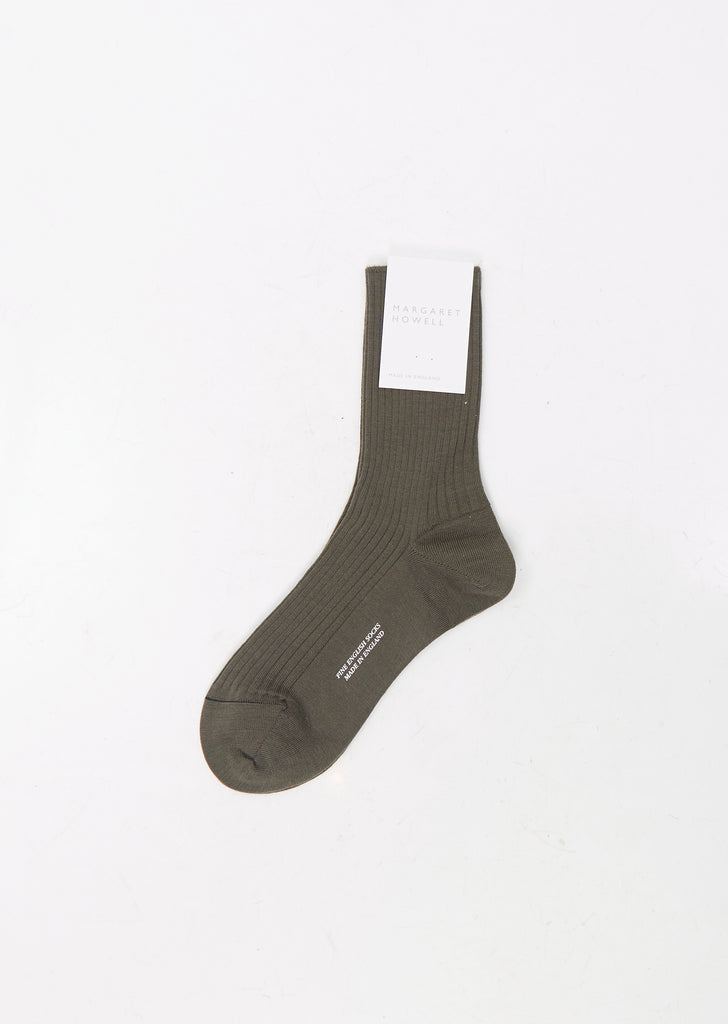 Margaret Howell dark sage ribbed crew sock in merino wool and nylon blend.
