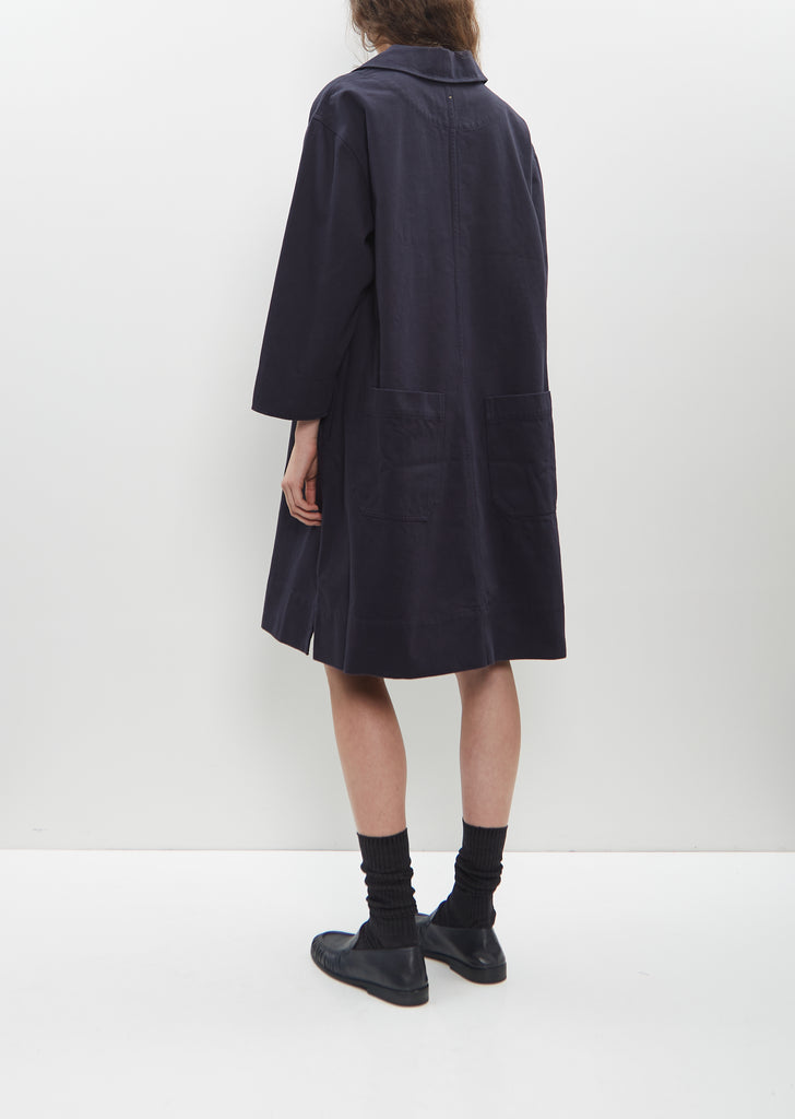 MHL by Margaret Howell ink blue smock dress in dense Italian cotton drill. Features open neck with spread collar, concealed side pockets, patch pockets at back, and side split hem. Relaxed fit.