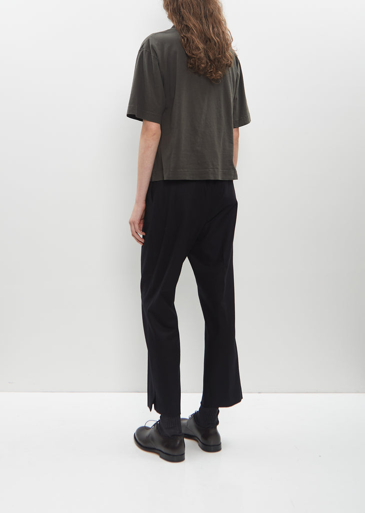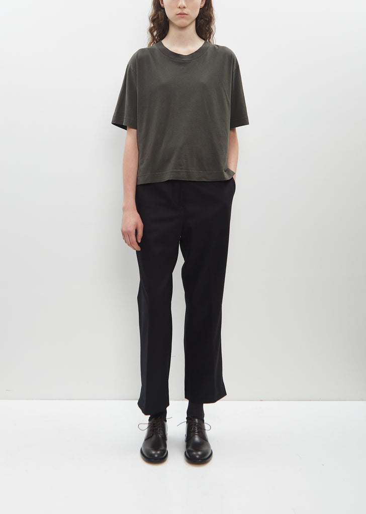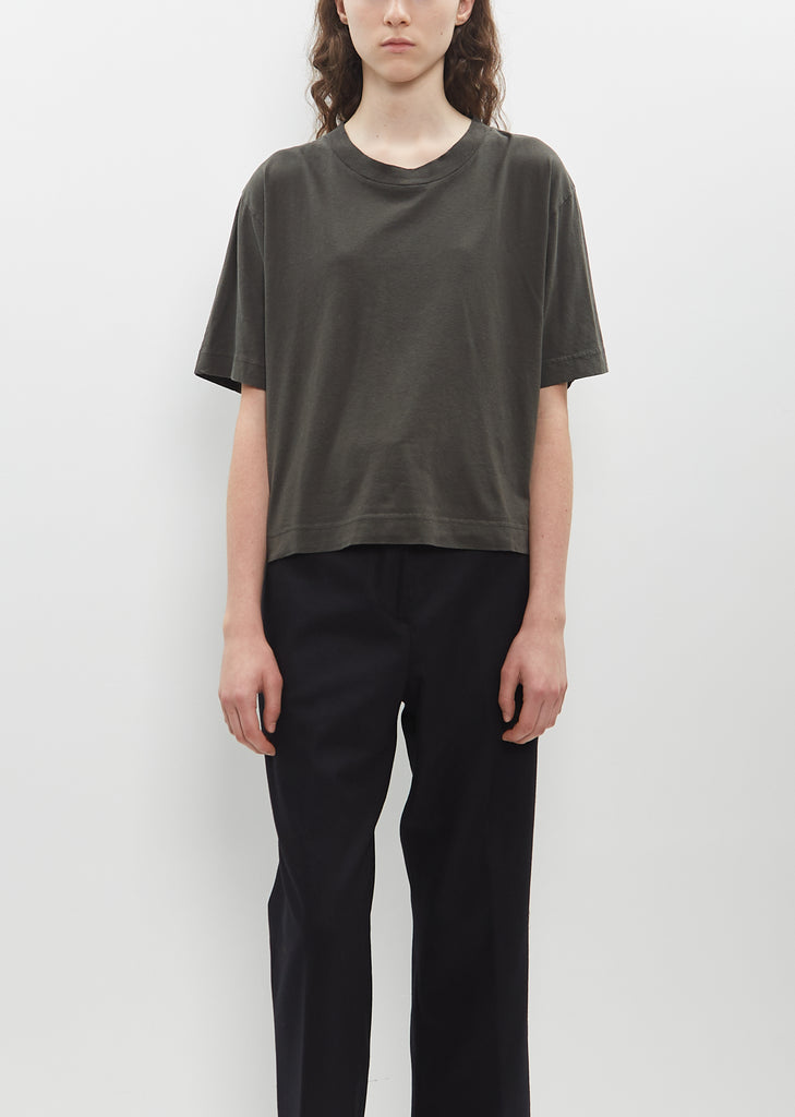 MHL by Margaret Howell khaki green slightly cropped crewneck t-shirt in cotton-linen blend. Features a ribbed neckline and side split hem.