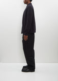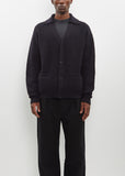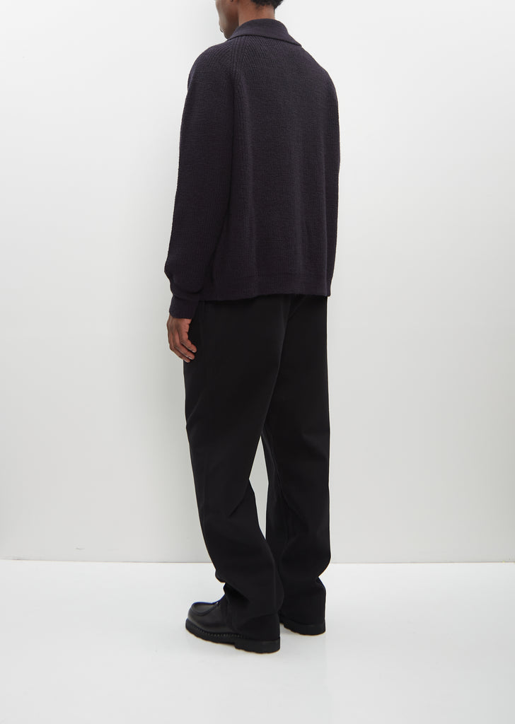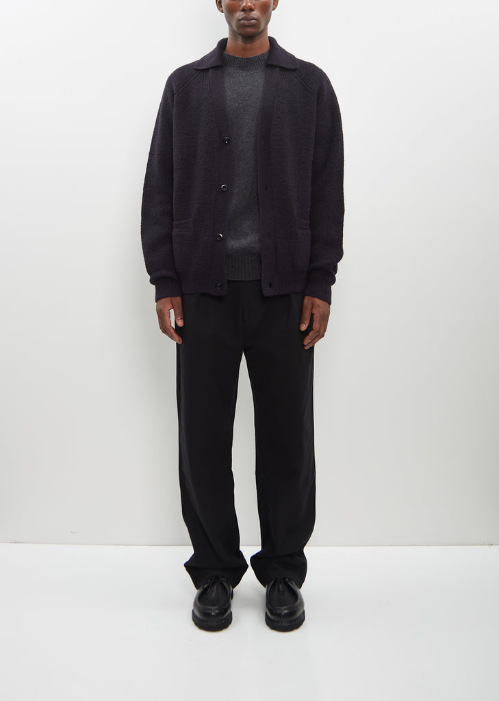 MHL by Margaret Howell ink blue collared cardigan with V-neckline knitted in mid-weight Italian wool. Features raglan sleeves, two front patch pockets, and contrasting ribbed trim on collar, placket, pockets, cuffs, and hem. Finished with black corozo brace buttons. Relaxed fit.