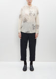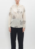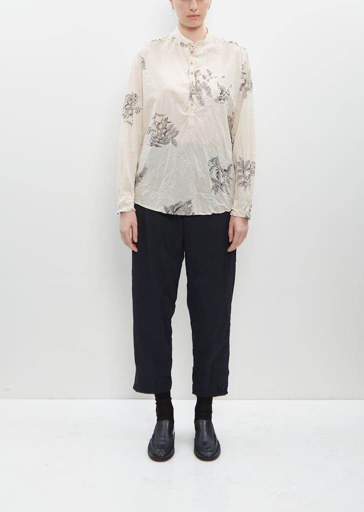 Pas de Calais khaki blouse with a band collar and a tortoise-hued buttoned half placket in cotton and linen blend with a black forest print throughout. Features a single rounded patch pocket at chest, a back yoke with a box pleat and buttoned cuffs.
