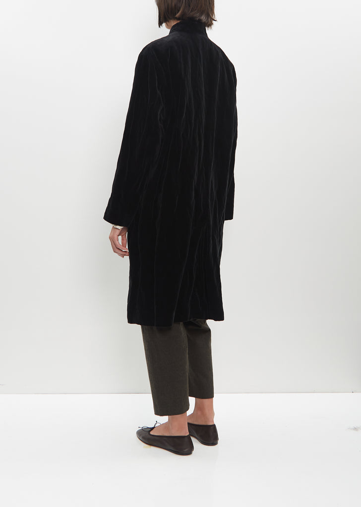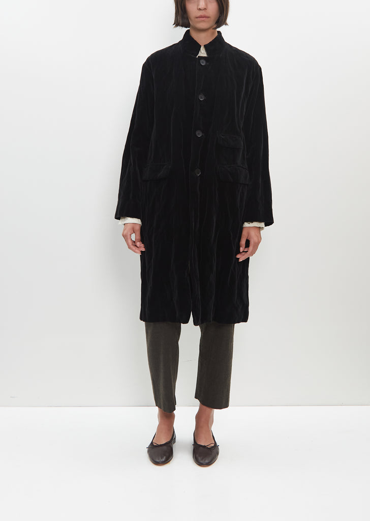 Pas de Calais black long straight coat with a stand collar and flap pockets at front in cotton velvet. Features a back slit at bottom hem, set-in shoulders and a tonal buttons closure at front. Bodice is lined in cotton and linen blend voile. Sleeves are lined in satin beige fabric.