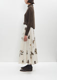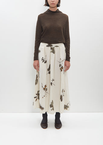 Pas de Calais printed ivory A-line pleated skirt with ties and buttons fastening at side in lightweight cotton with a crinkled effect. Featurres a clean waistline and side seam pockets.