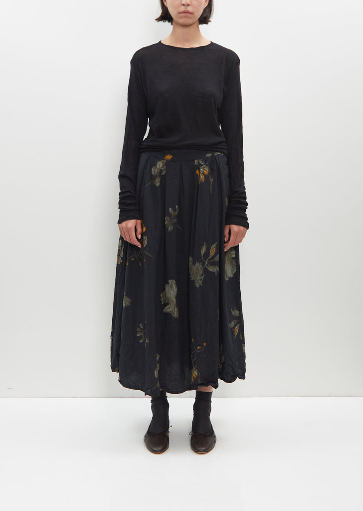 Pas de Calais printed black A-line pleated skirt with ties and buttons fastening at side in lightweight cotton with a crinkled effect. Featurres a clean waistline and side seam pockets.