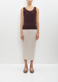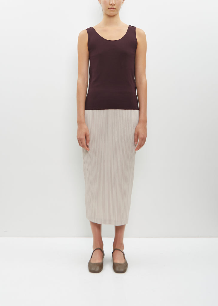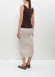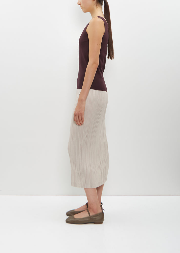 Pleats Please by Issey Miyake light beige pull-on straight skirt with concealed side seam pockets and an elasticated waistband in fine pleated technical chiffon.