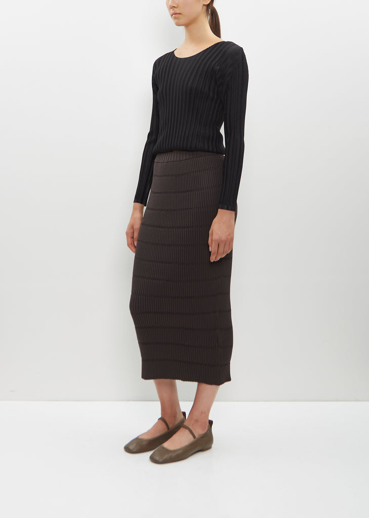 Pleats Please by Issey Miyake chocolate brown pull-on skirt in ribbed stretch knit. Features an elasticated ribbed waistband. Straight, closer fit.