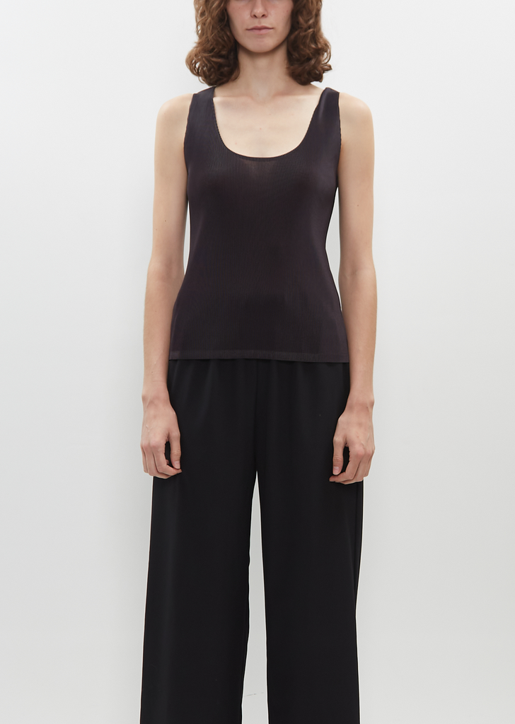 Pleats Please by Issey Miyake charcoal grey tank top with a scoop neckline in finely pleated technical chiffon. Closer fit.