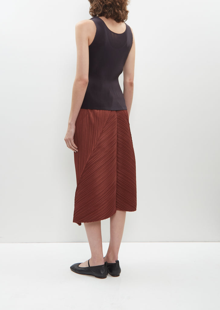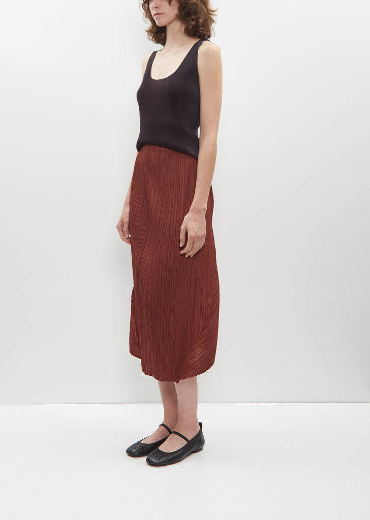 Pleats Please by Issey Miyake brown pull-on skirt with a flared, triangular shape and inverted pleating at back to create a unique shape in pleated mid-weight crepe. Features an elasticated waistband.