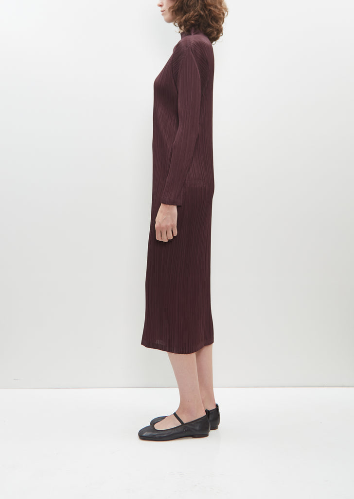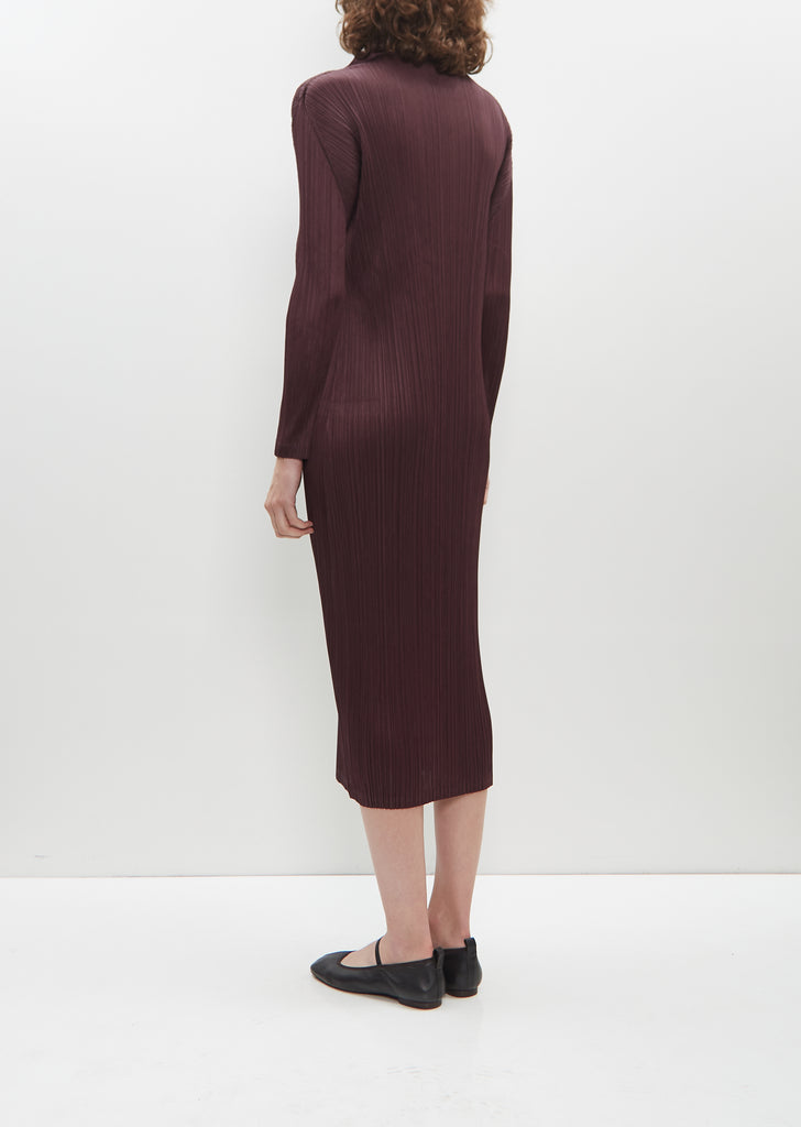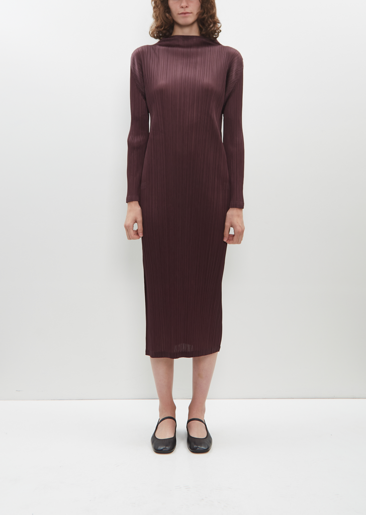 Pleats Please by Issey Miyake dark brown dress with a high neckline and 3/4 sleeves in pleated technical chiffon. Closer fit.
