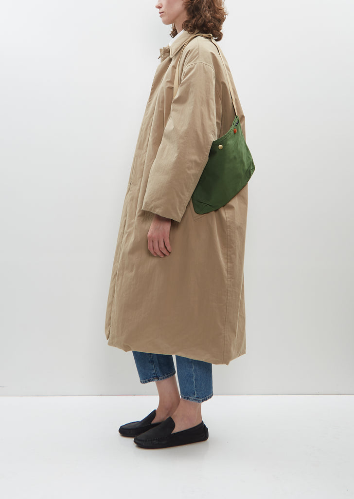 Porter - Yoshida & Co green shoulder bag with adjustable strap and three snap button top closure in cotton canvas. Features an exterior zipper pocket and three interior slip pockets.