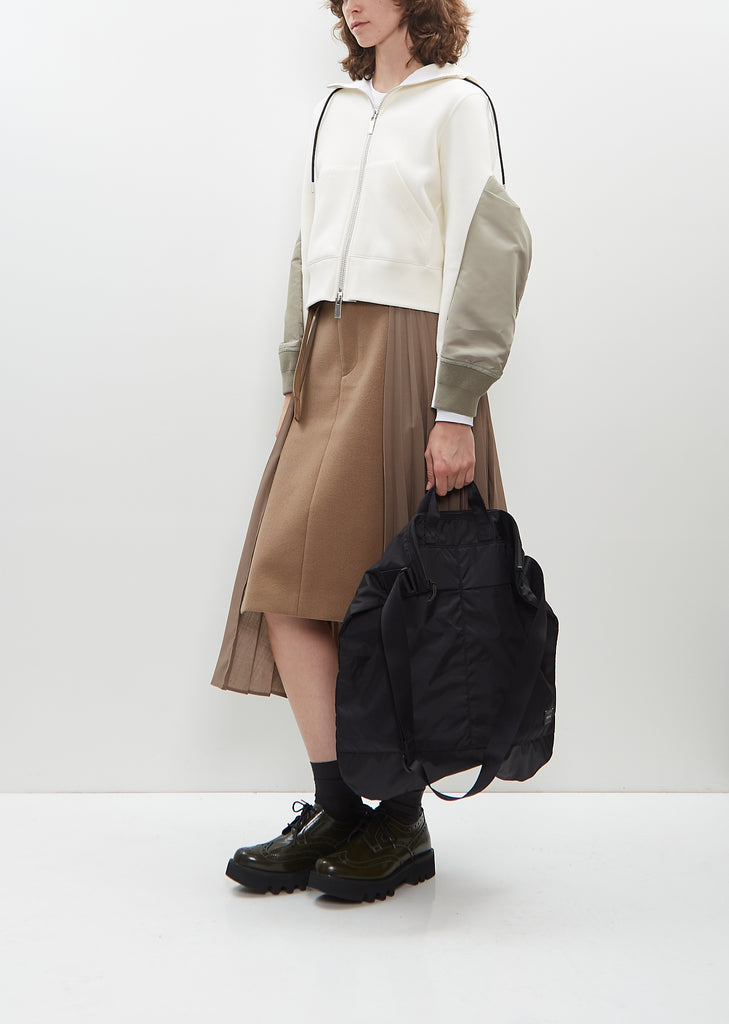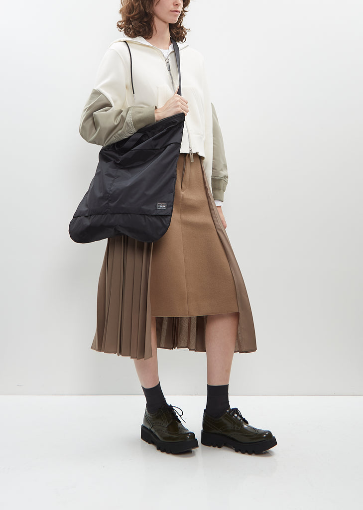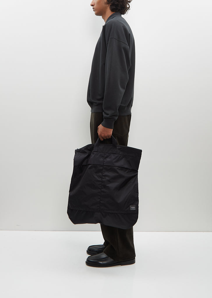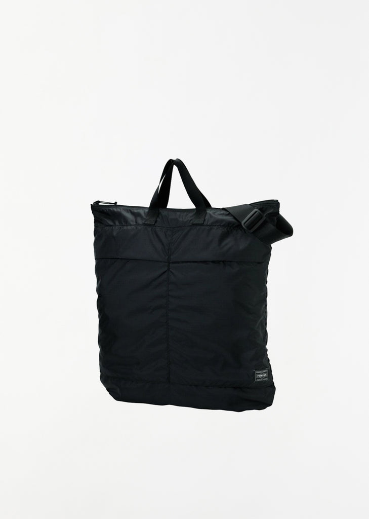 Porter - Yoshida & Co black packable lightweight tote bag with short handles and an adjustable shoulder ripstop strap in nylon. Features a tonal top zipper, overlap slip pockets with snap closure, and a single interior zip pocket. This bag can be packed into the interior zip pocket.