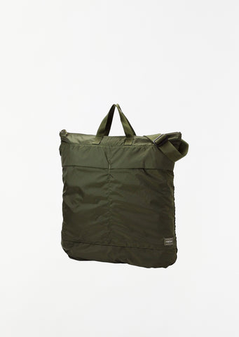 Porter - Yoshida & Co olive packable lightweight tote bag with short handles and an adjustable shoulder ripstop strap in nylon. Features a tonal top zipper, overlap slip pockets with snap closure, and a single interior zip pocket. This bag can be packed into the interior zip pocket.