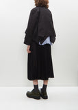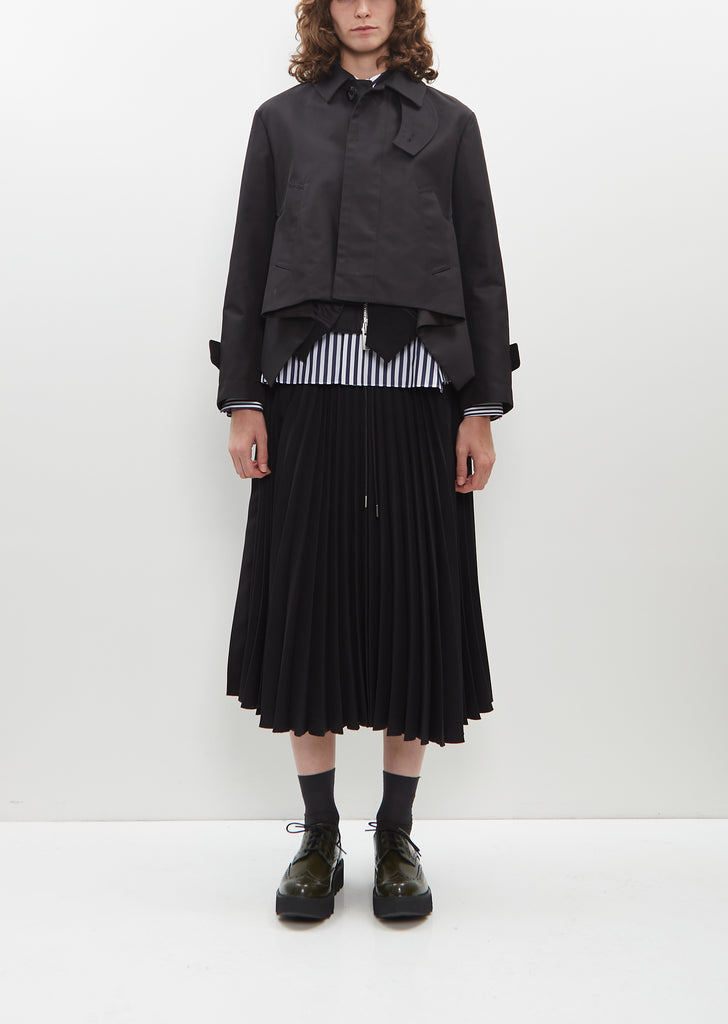 Sacai black hybrid layered jacket with handkerchief hem and double closure at front in cotton blend and nylon. Features a spread collar, angled welt pockets, pleats at back sides, adjustable buttoned tabs at cuffs, a concealed button placket with single exposed top button and an interior concealed zipper closure. Lined in tonal cupro fabric.