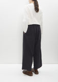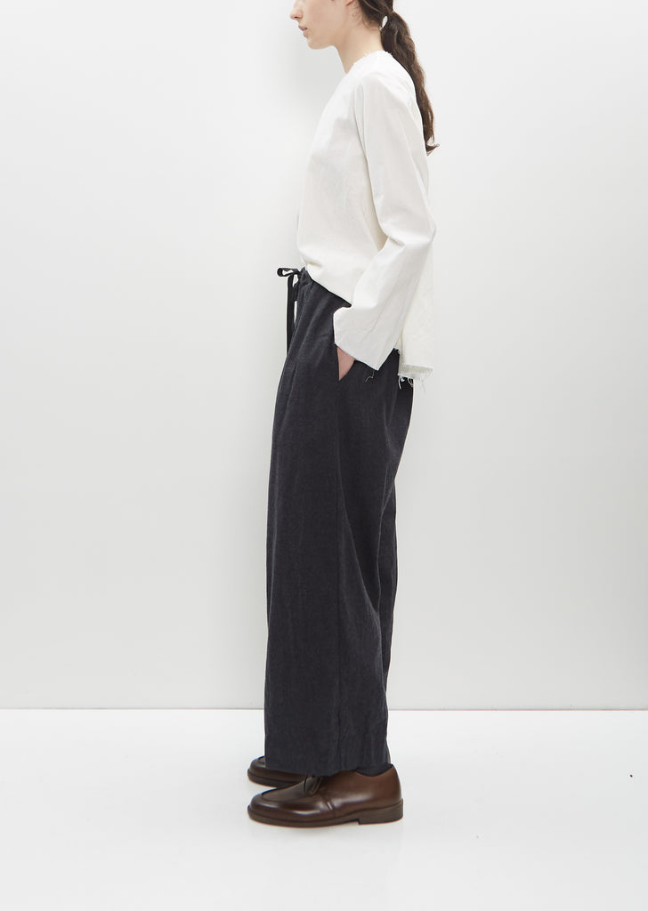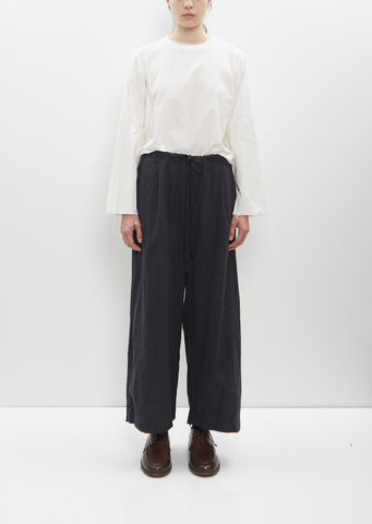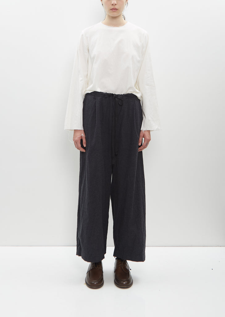 SCHA anthracite grey cropped pull-on pants with wide legs and an elasticated waist with grosgrain ribbon closure in lightweight waxed crinkle cotton. Features side seam pockets.