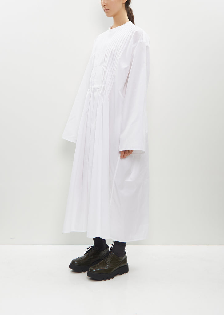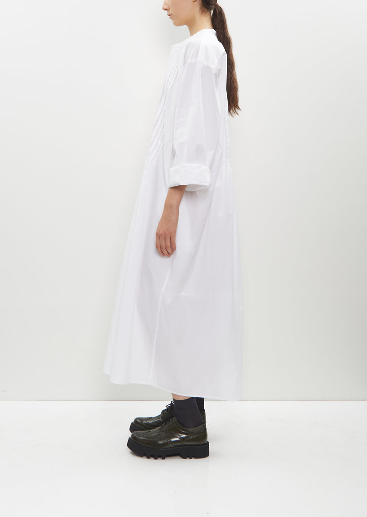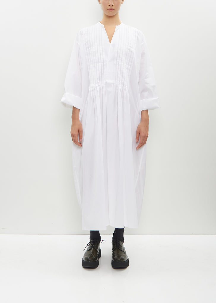Sofie D'Hoore white pullover oversized dress with pleated panels at front and back in crisp cotton poplin. Features a small band collar, a V-neckline, dropped shoulders, and wide sleeves.