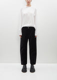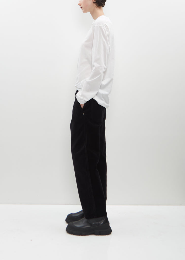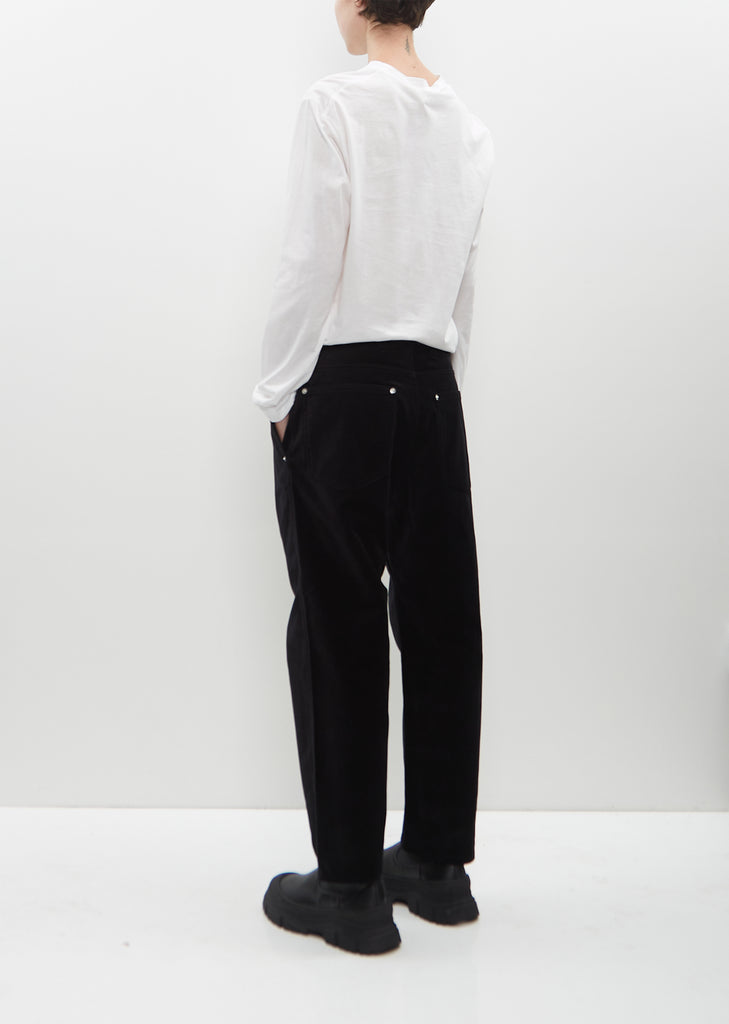 Sofie D'Hoore black straight pants with wide legs in cotton velvet. Features belt loops, two angled pockets at front, two patch pockets at back, silver-hued rivets and a five button concealed fly fastening.