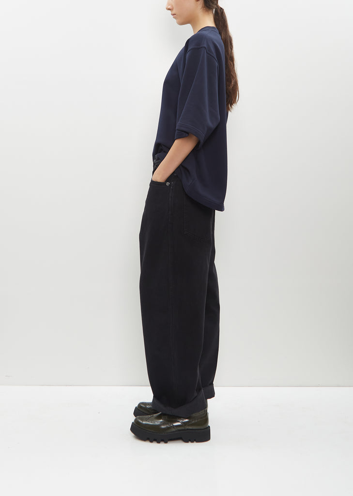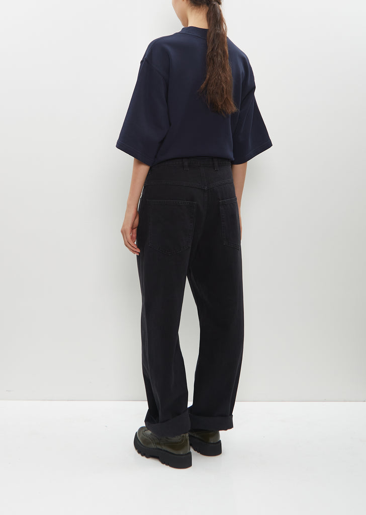 Sofie D'Hoore black straight pants with wide legs and 5-pocket construction in cotton denim. Features belt loops, silver-hued flat rivets detailing and a five buttons concealed fly fastening.