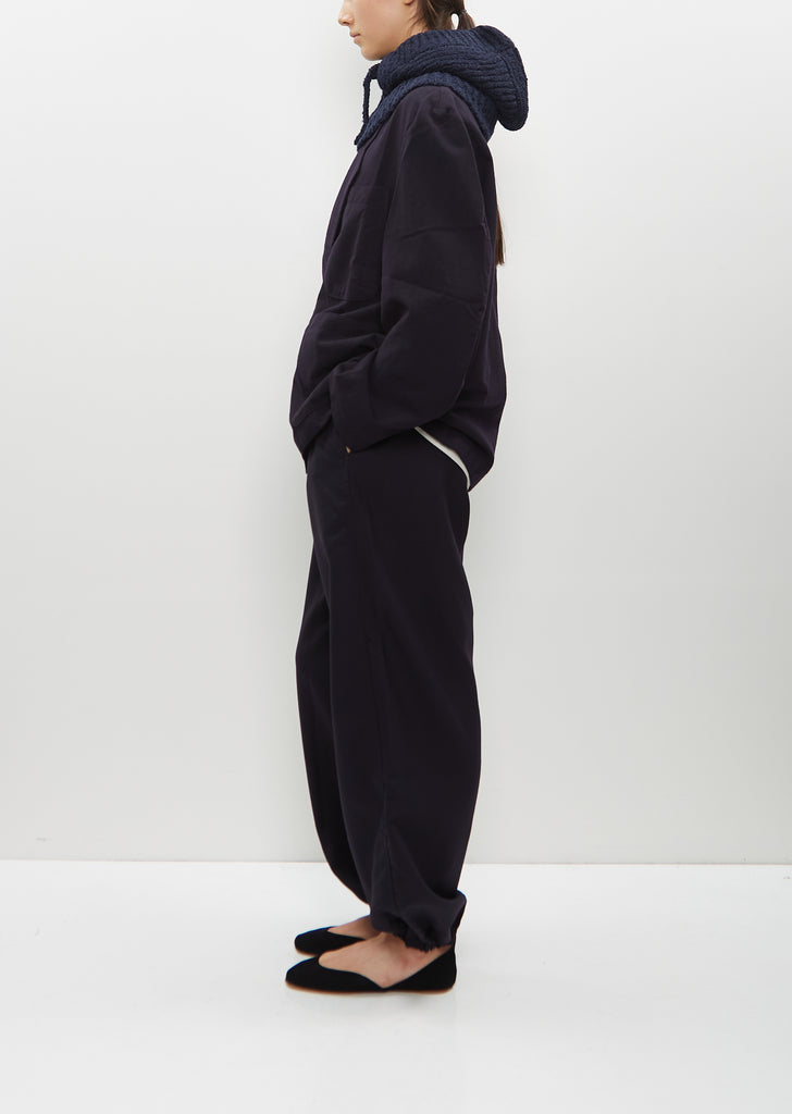 Sono navy oversized ribbed balaclava with hand-crocheted fastening cords in wool aplaca blend spun in Italy.