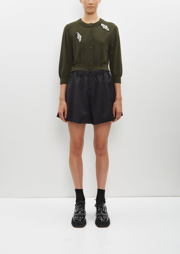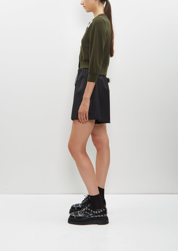 Simone Rocha charcoal grey and black pull on shorts with faux-fur detail at back welt pocket in Venitian wool blend twill. Features an elasticated waist with adjustable drawstrings and side seam pockets. Fully lined in black cupro blend fabric.