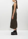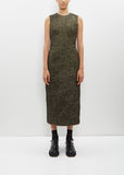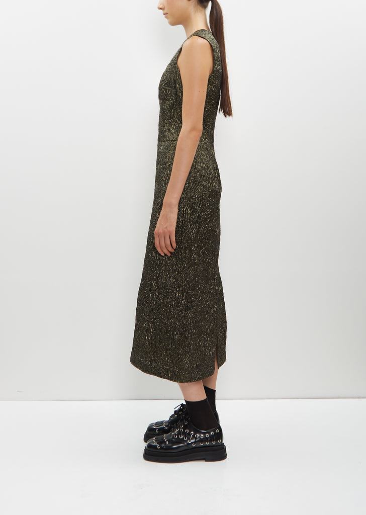 Simone Rocha metallic green straight sleeveless dress with darts at front and back in jacquard fabric. Features side seam pockets and a concealed zip closure at back. Fully lined in tonal fabric.