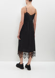 Simone Rocha black A-line slip dress with lace trim at neckline and hem in crepe de chine. Features a sweetheart neckline, empire waist and thin adjustable straps.