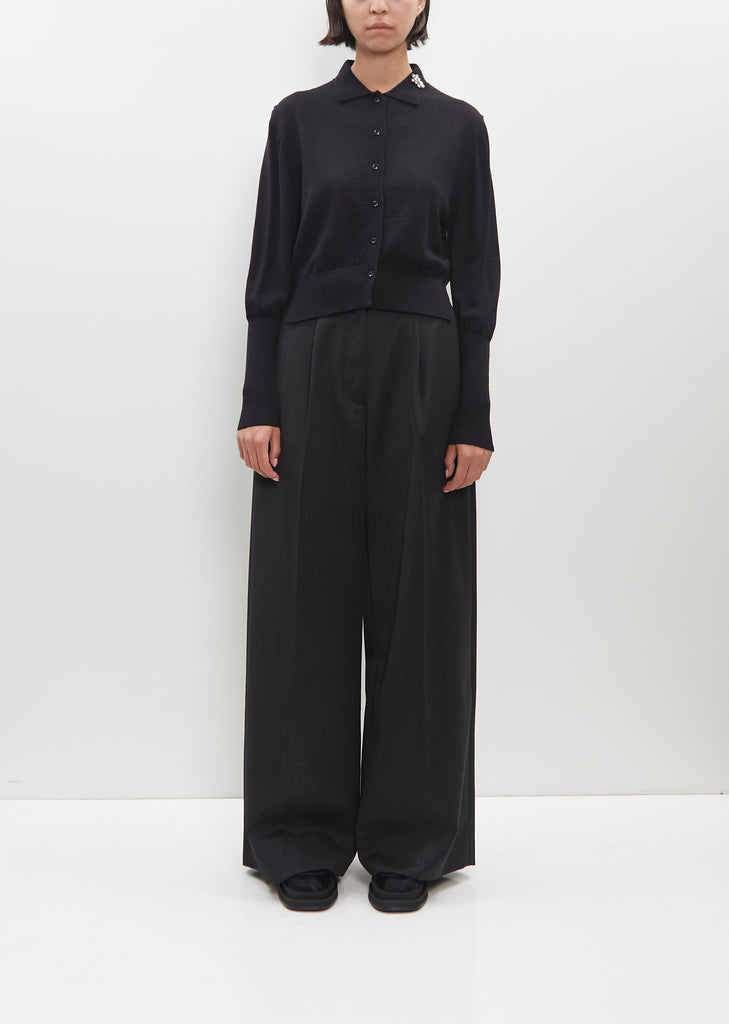 Simone Rocha black polo sweater with embellished collar in merino wool and silk blend fine knit. Features a spread collar, deep rib knit cuffs and a three button closure at front.