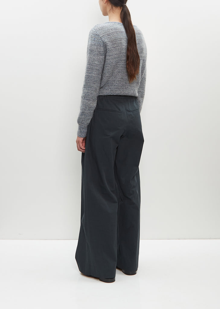 Stephan Schneider forest green tailored trousers with wide legs and a low-rise elasticated waist in high-density cotton poplin. Features pleats at front waist, side seam pockets, welt pockets at back and a button and zip-fly fastening. Relaxed fit.