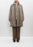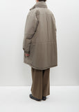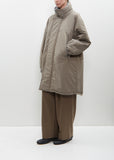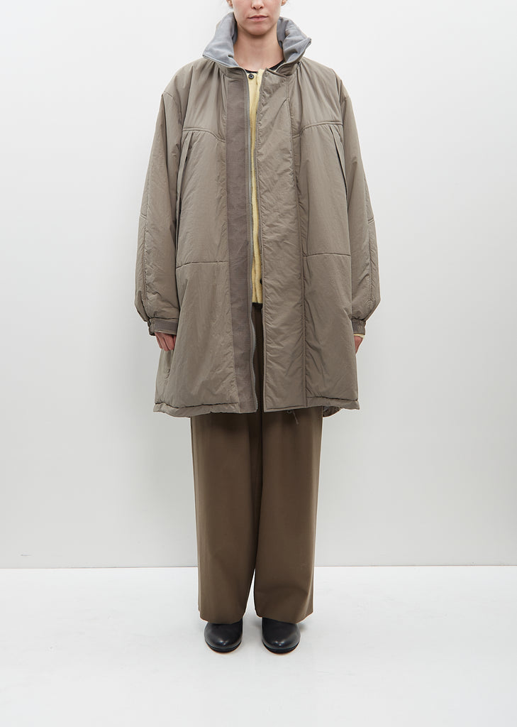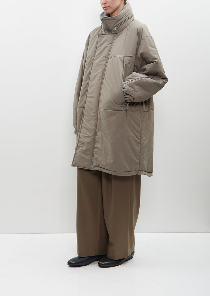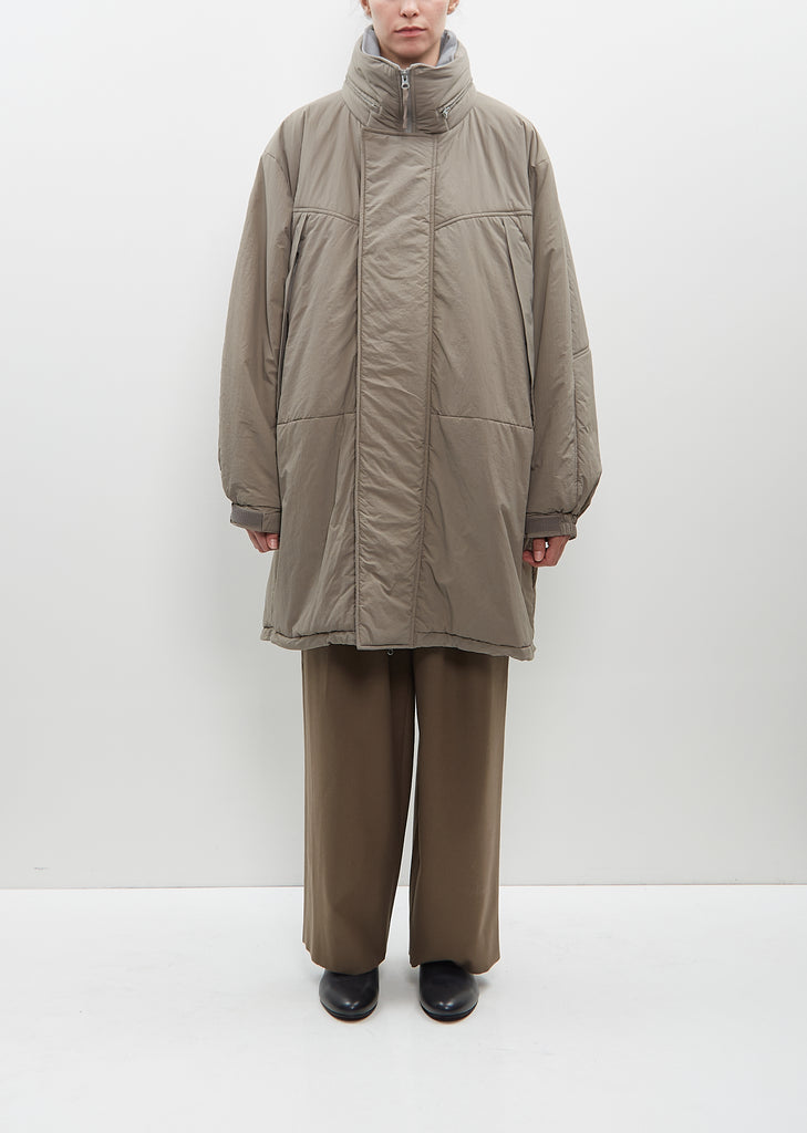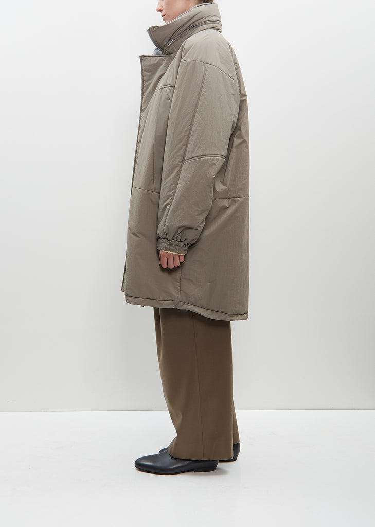 Stein khaki padded jacket with a suede lined stand collar in nylon. Features a concealed hood inside collar, vertical zipper pockets, interior vertical slip pockets and concealed zipper front with Velcro placket fastening. Lined in tonal satin fabric. Oversized fit.