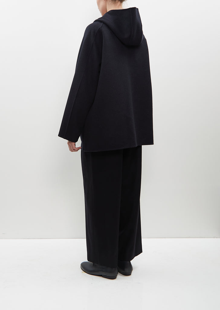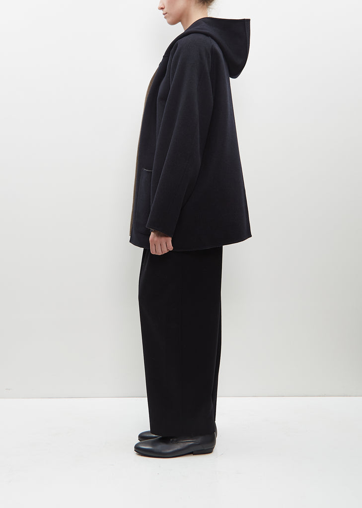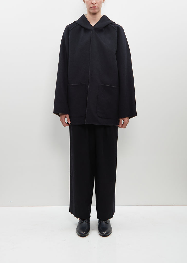 Stein navy and grey khaki reversible hooded half coat with a two press button closure in wool and cashmere blend. Features raglan sleeves, front patch pockets on navy side, and vertical side seam pockets on grey khaki side. Loose, relaxed fit.