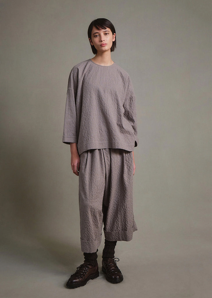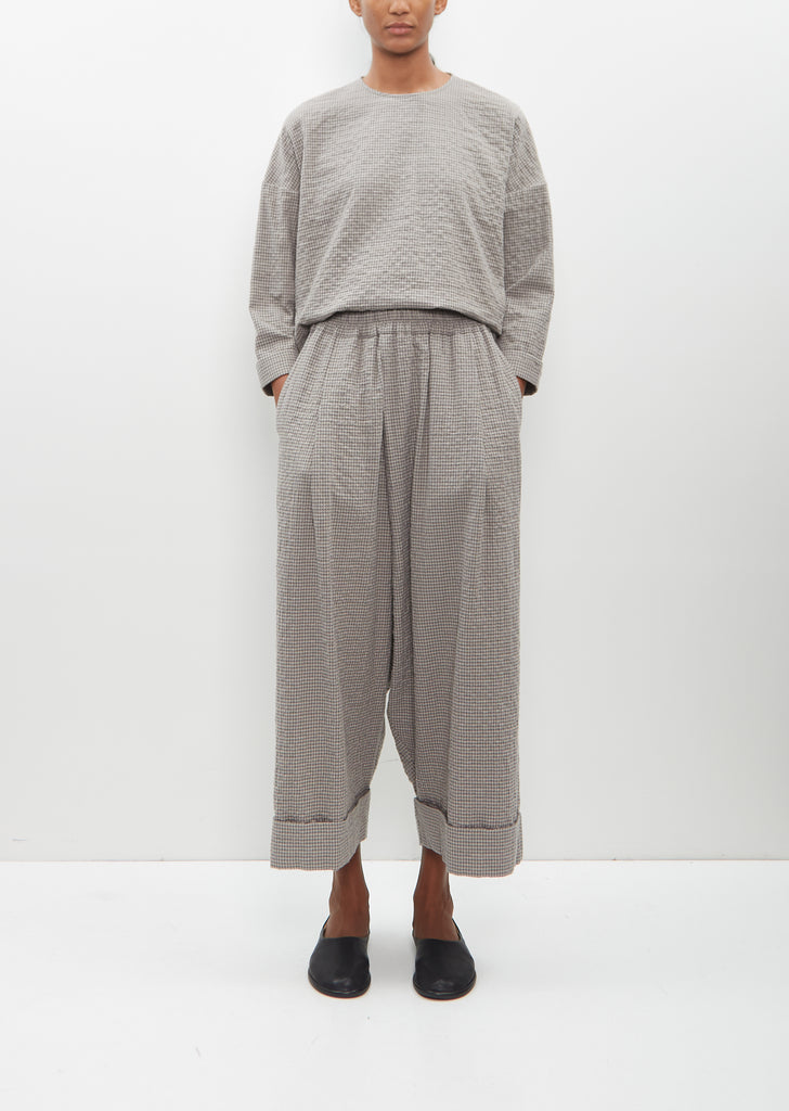 Toogood signature Baker Trouser with cropped, voluminous legs and elasticated waist in a new mini gingham check cotton with a subtle seersucker texture. Features front pleats, hidden side pockets and low back patch pockets. Finished with deep turned up cuffs.