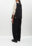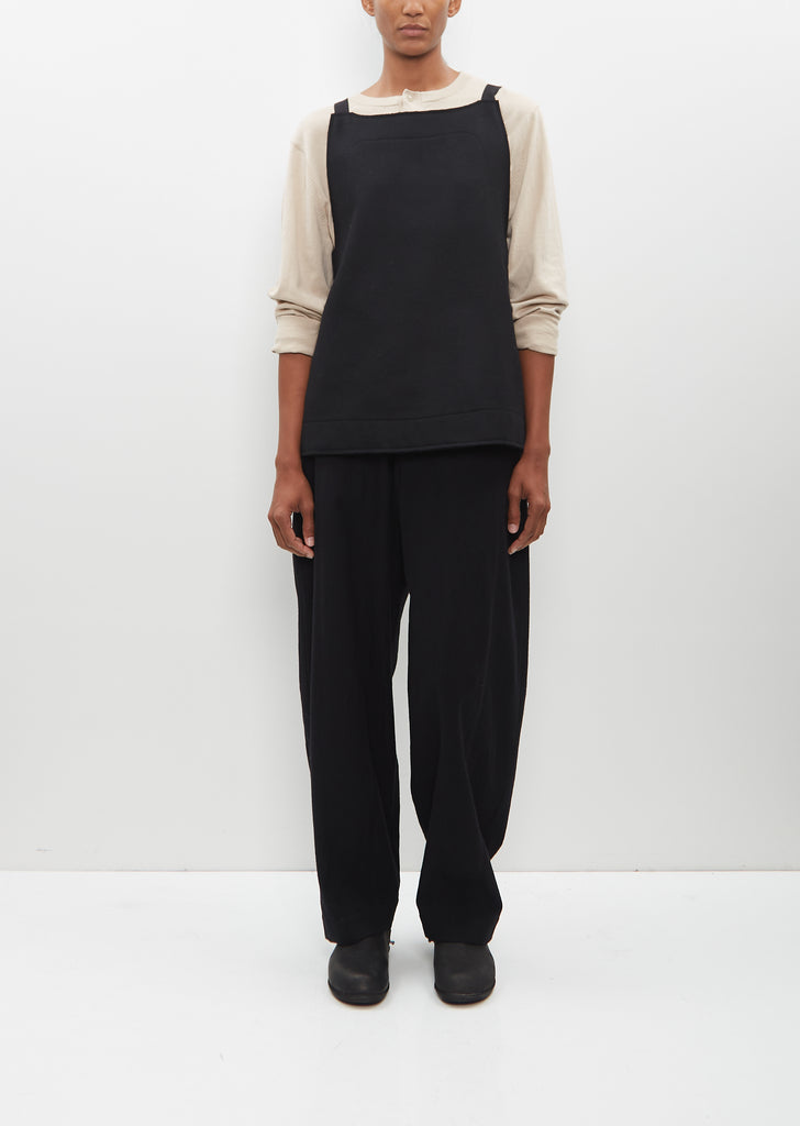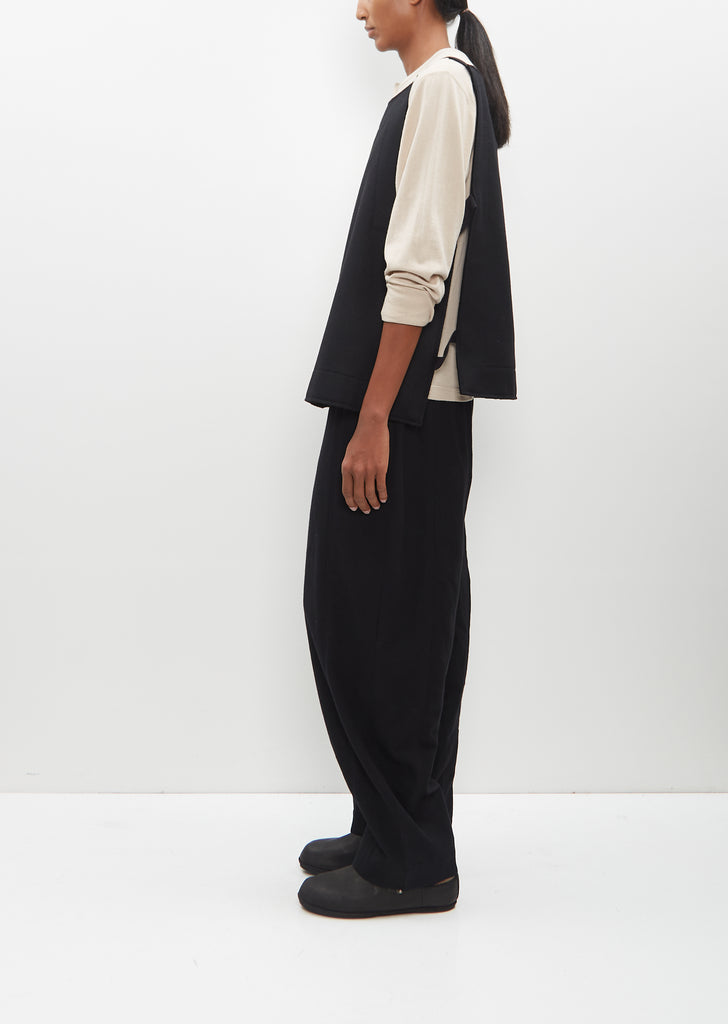 Toogood black gilet vest in a felted virgin wool blend. Features tonal ribbon trim shoulder straps and double side straps. Detailed with tonal topstitching at borders at both front and back panels, and signature raw edge finish. Pulls over.
