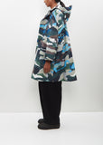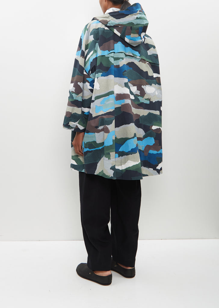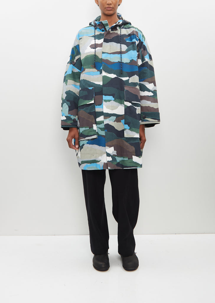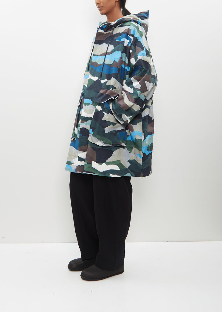 Toogood parka coat in brand's original Torn Paper Camo print with a waxed water repellent finish. Features a peaked hood which can be adjusted as required and large utility flap pockets. Detailing includes rubber coated metal trims.