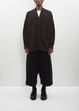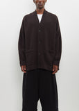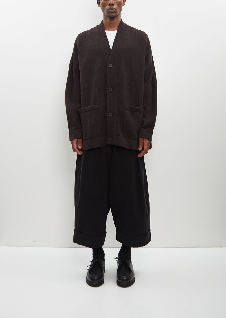 Toogood brown oversized cardigan in a superfine Scottish lamb's wool. Features large front placket with horn buttons, front patch pockets, and ribbed trim along neckline, placket, cuffs, and hem.