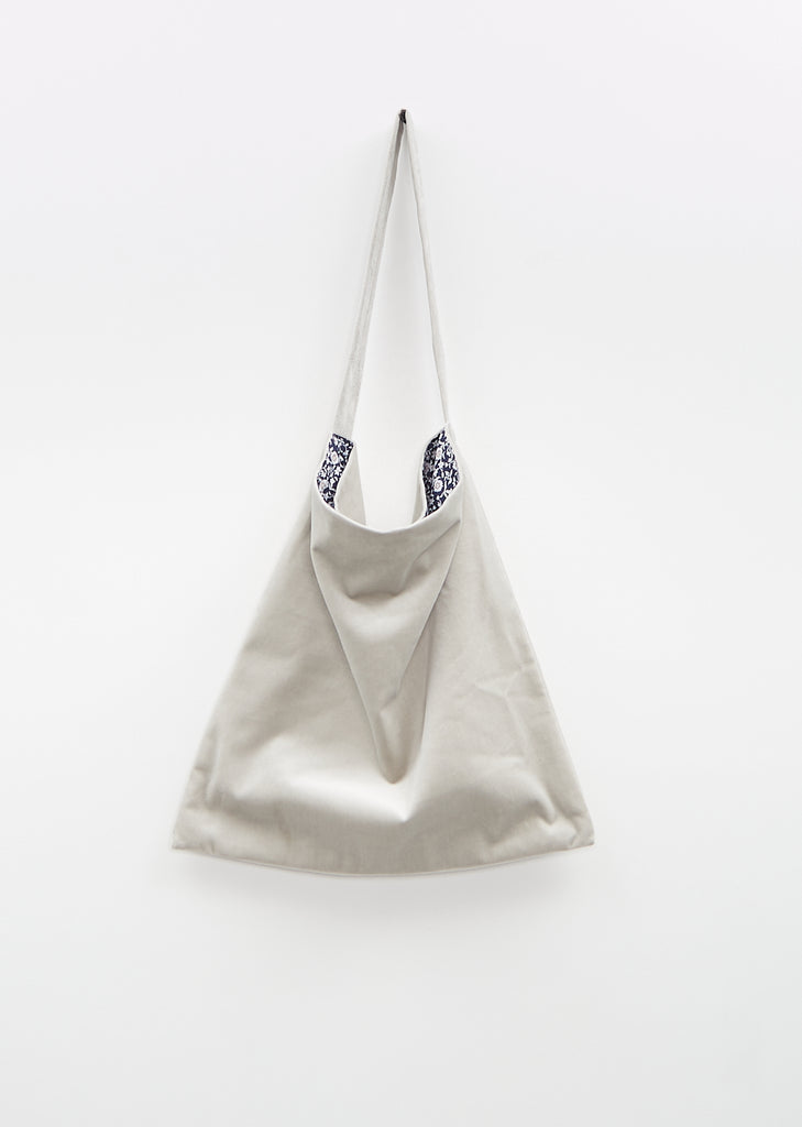 Toujours smoke grey square bag with shoulder strap and a single interior slip pocket in cotton velvet. Lined in navy floral patterned cotton fabric.