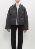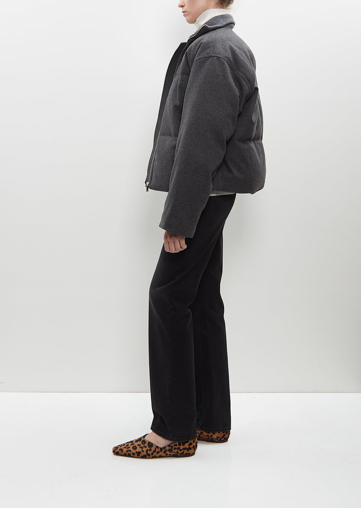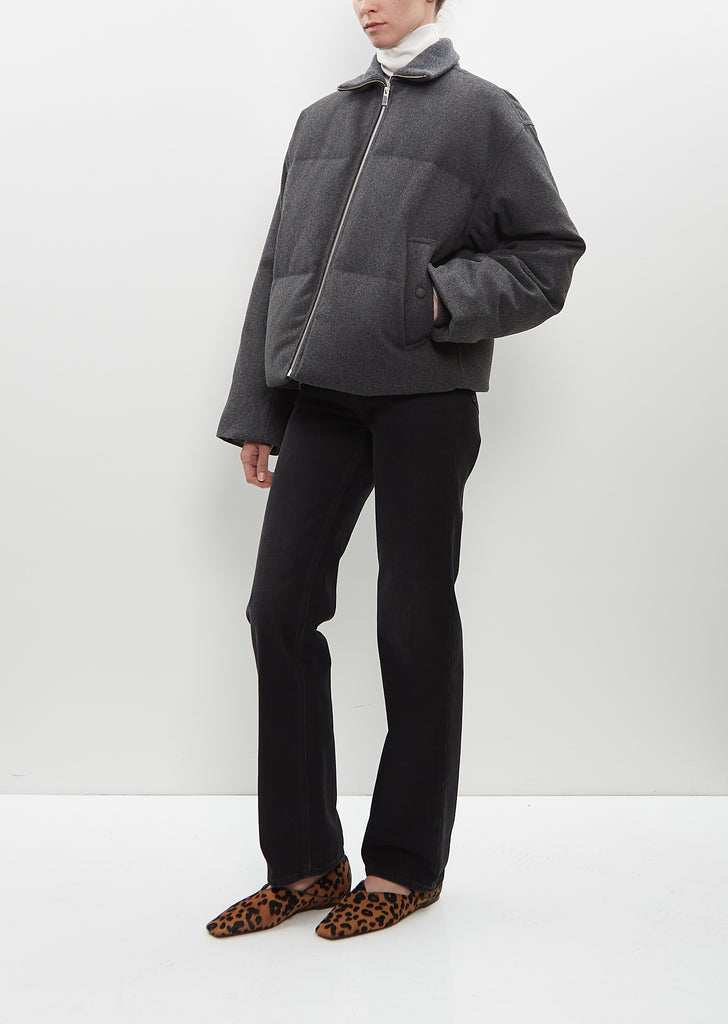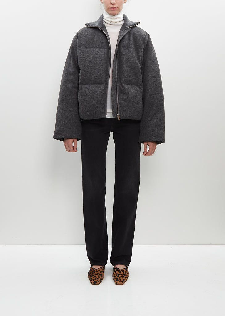 Totême grey mélange cropped puffer jacket with a high collar in mid-weight wool blend flannel with boudin quilting. Features press button welt pockets at front, a ribbed trim at collar, concealed cuffs and a silver-toned front zipper closure. Fully lined in black satin fabric.