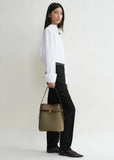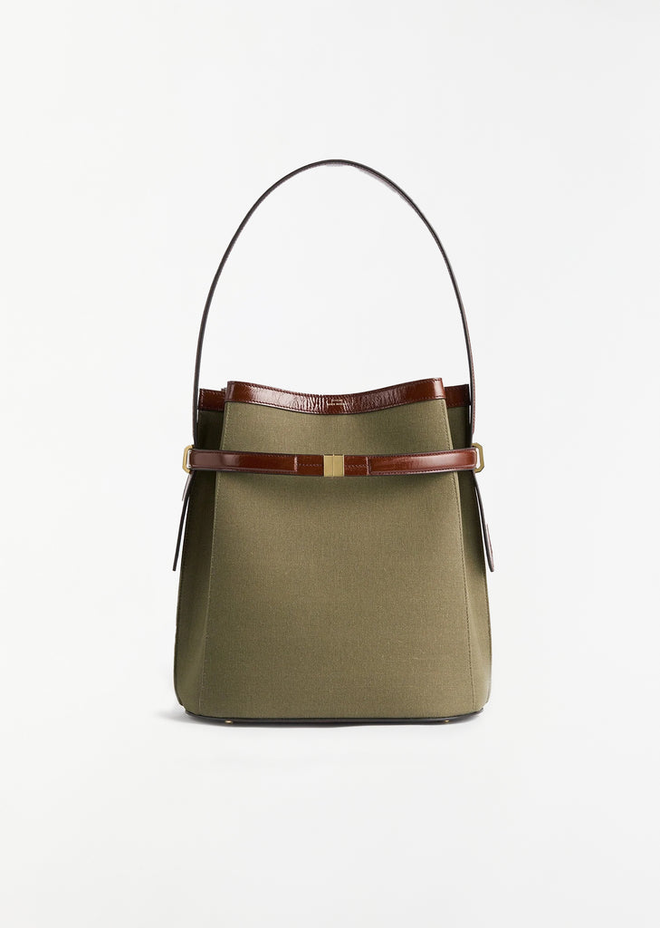 Totême khaki green bucket bag with a belt detail and gold-tone slide side clasps in cotton and linen canvas. Features a fixed shoulder strap, two interior slip pockets and an interior lobster clasp for closure. Finished with oxblood-red leather detailing at shoulder strap, top opening, belt, and bottom. Lined in microfiber. Gold-tone hardware.