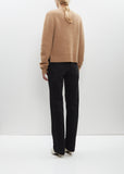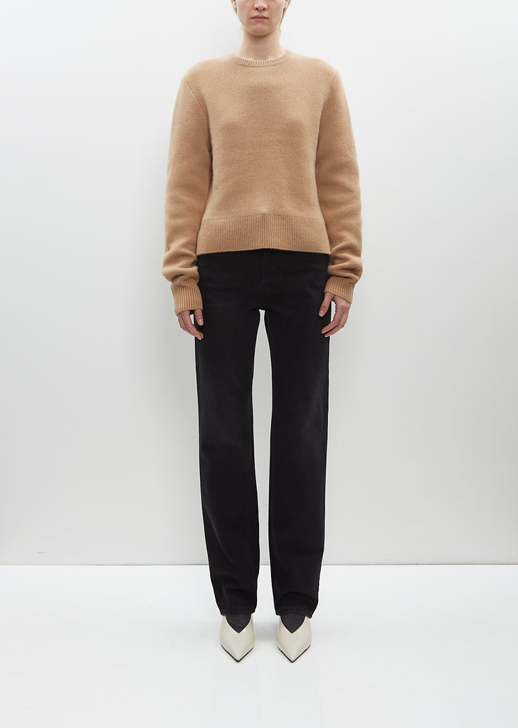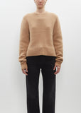 Totême camel slightly cropped sweater with a crew neck and set-in shoulders in mid-weight cashmere and merino wool knit. Features a wide bottom hem, split side hems and embroidered logo at left sleeve. Finished with a rib trim at neck, cuffs and hem.