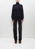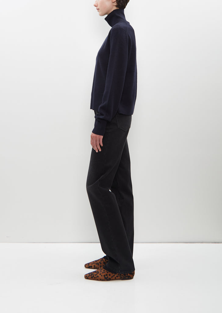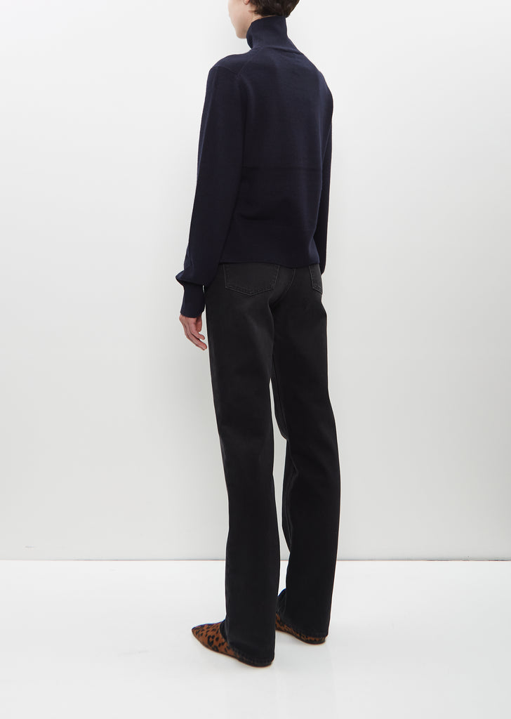 Totême navy turtleneck sweater with a cropped, petite silhouette in light cashmere. Features ribbed edges with a discreet monogram on the sleeve and side hem slits for drape.