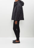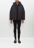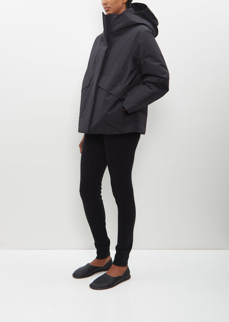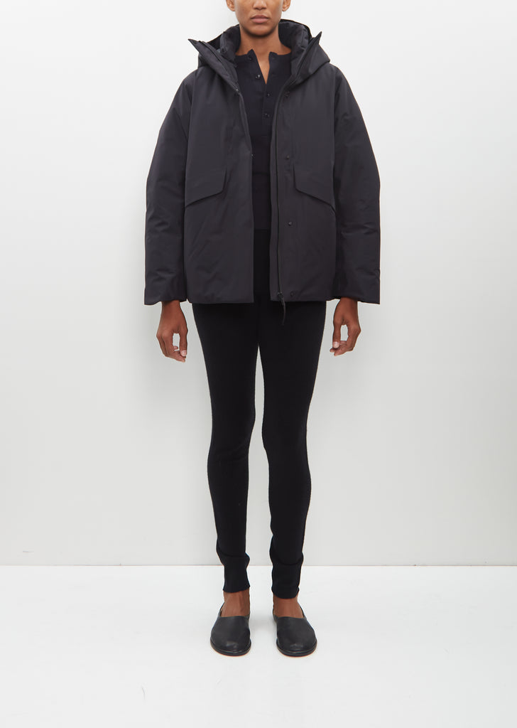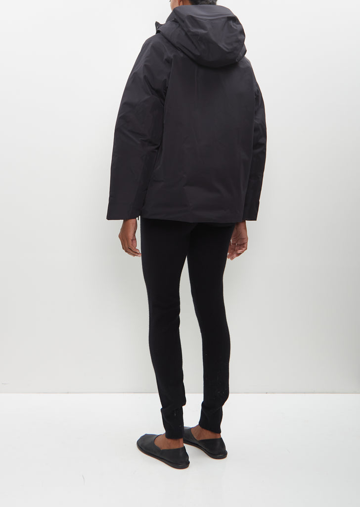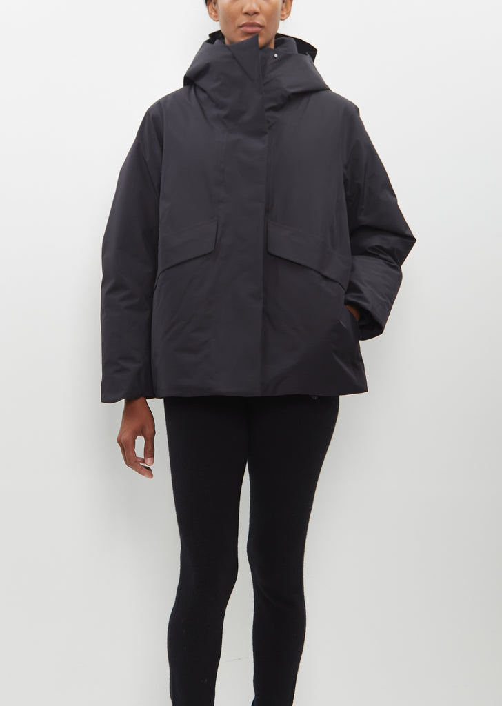 Veilance black loose-fit jacket in a durable lightweight waterproof, windproof and breathable nylon fabric. Features stormhood, drop shoulders, front flap pockets with additional side zip, interior slip pocket, and concealed zippered front placket with press buttons. Filled with 850 fill European grey goose down.