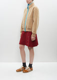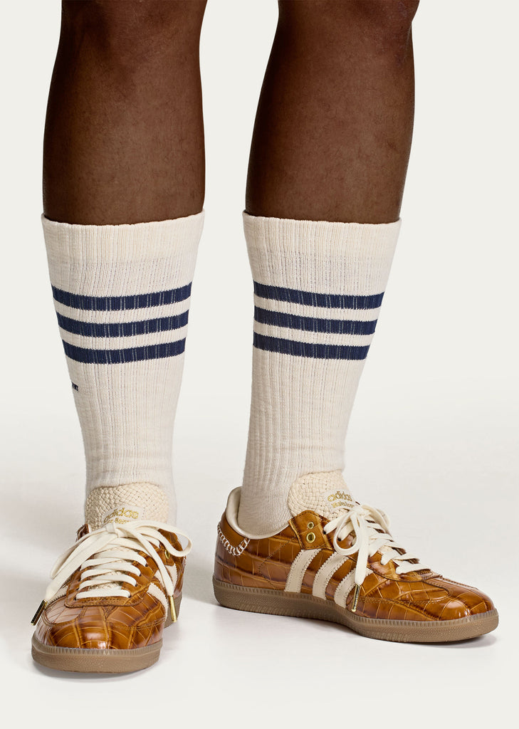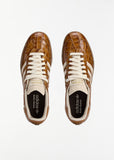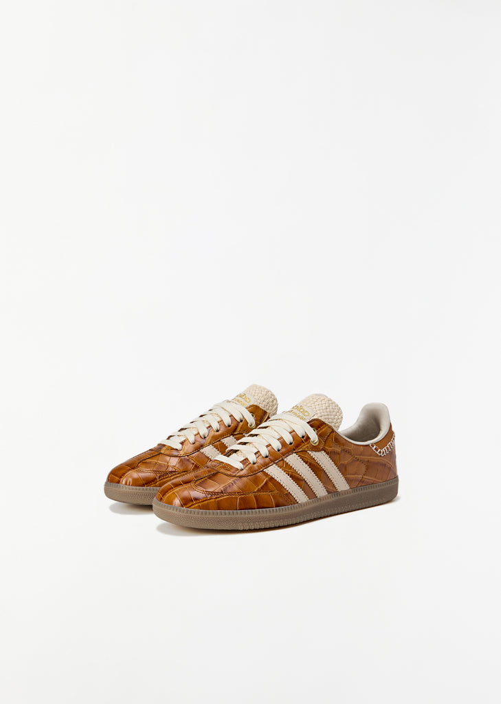 Wales Bonner x Adidas classic low top Samba sneaker with a handmade woven leather tongue in brown croc embossed leather. Features stitching details, white lace-up closure, contrasting night red satin lining, and a rubber sole.