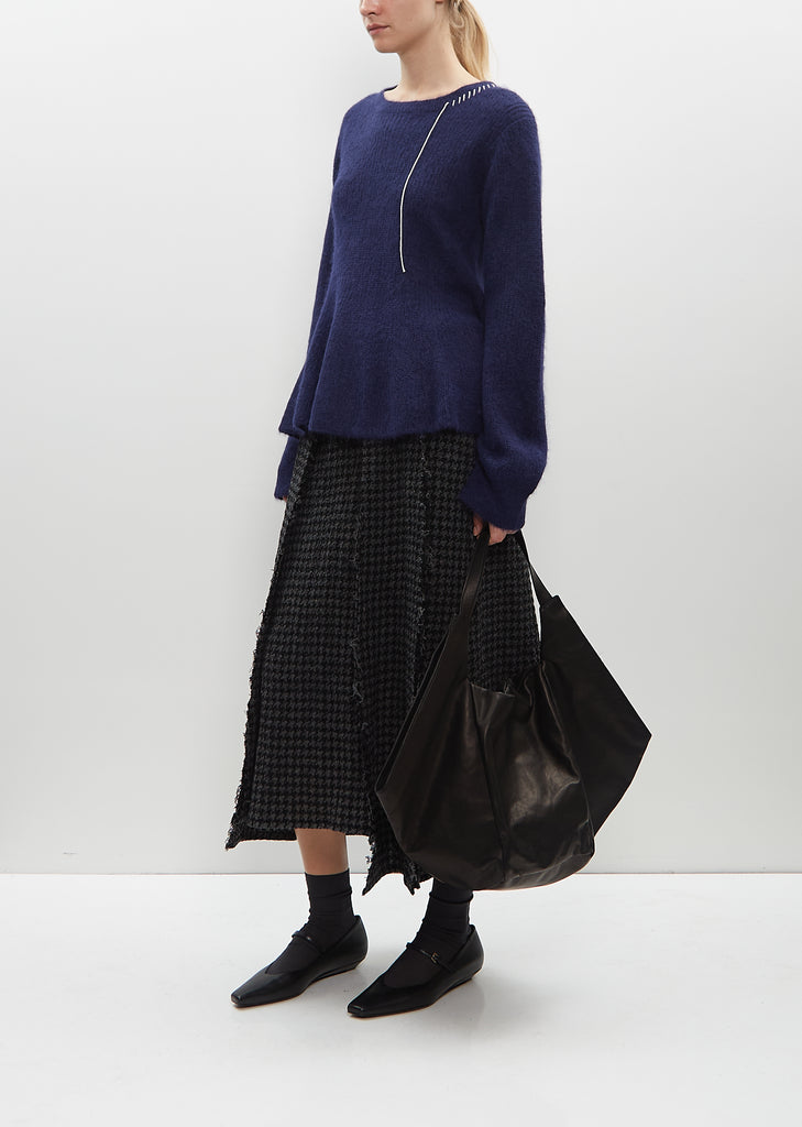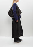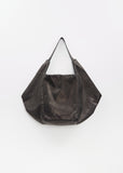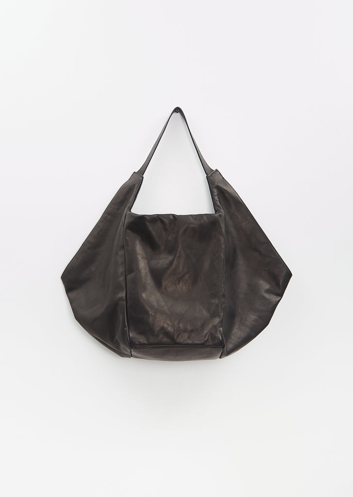 Yohji Yamamoto black shoulder bag with zippered openings on either side in smooth nappa leather. Features a top handle and two interior slip pockets.